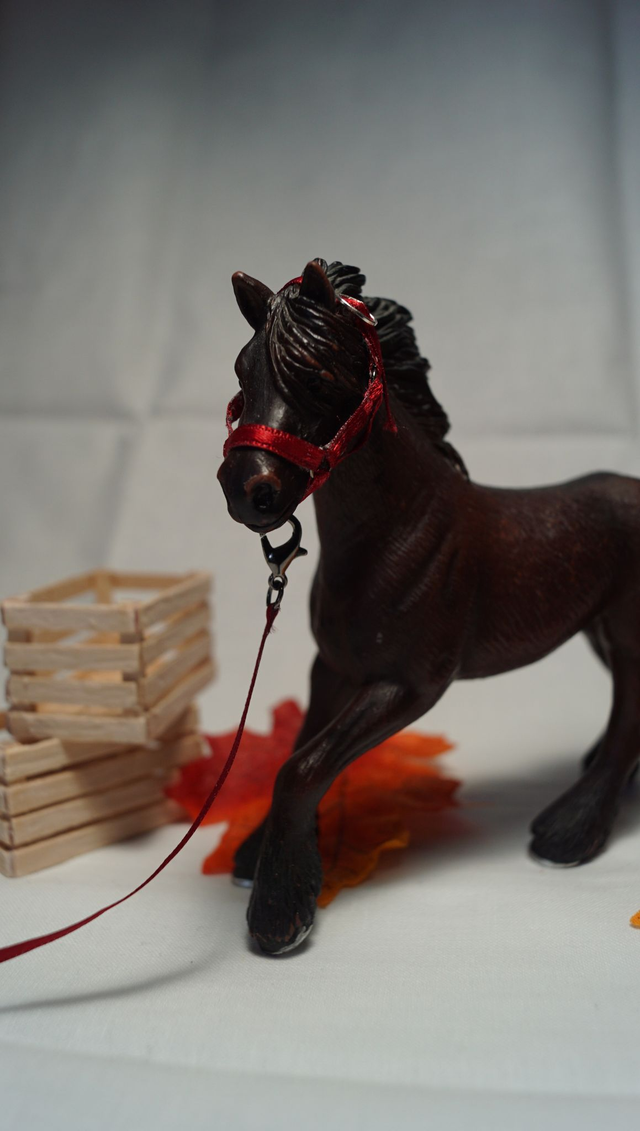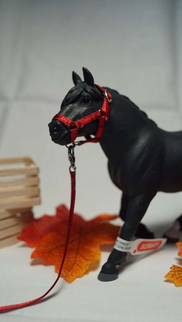 Chaque ensemble est réalisé à la main avec soin : ruban solide pour le licol et la longe, anneaux métalliques pour un rendu réaliste et durable. Idéal pour compléter une écurie miniature, enrichir une collection ou mettre en scène vos figurines.